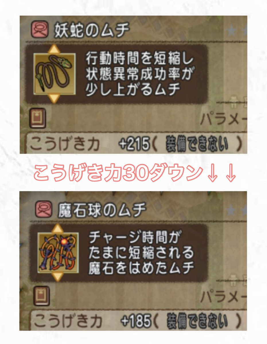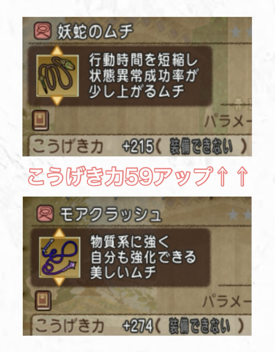 ただ、デメリットもあり、こうげき力が妖蛇と比べて30も下がることです。